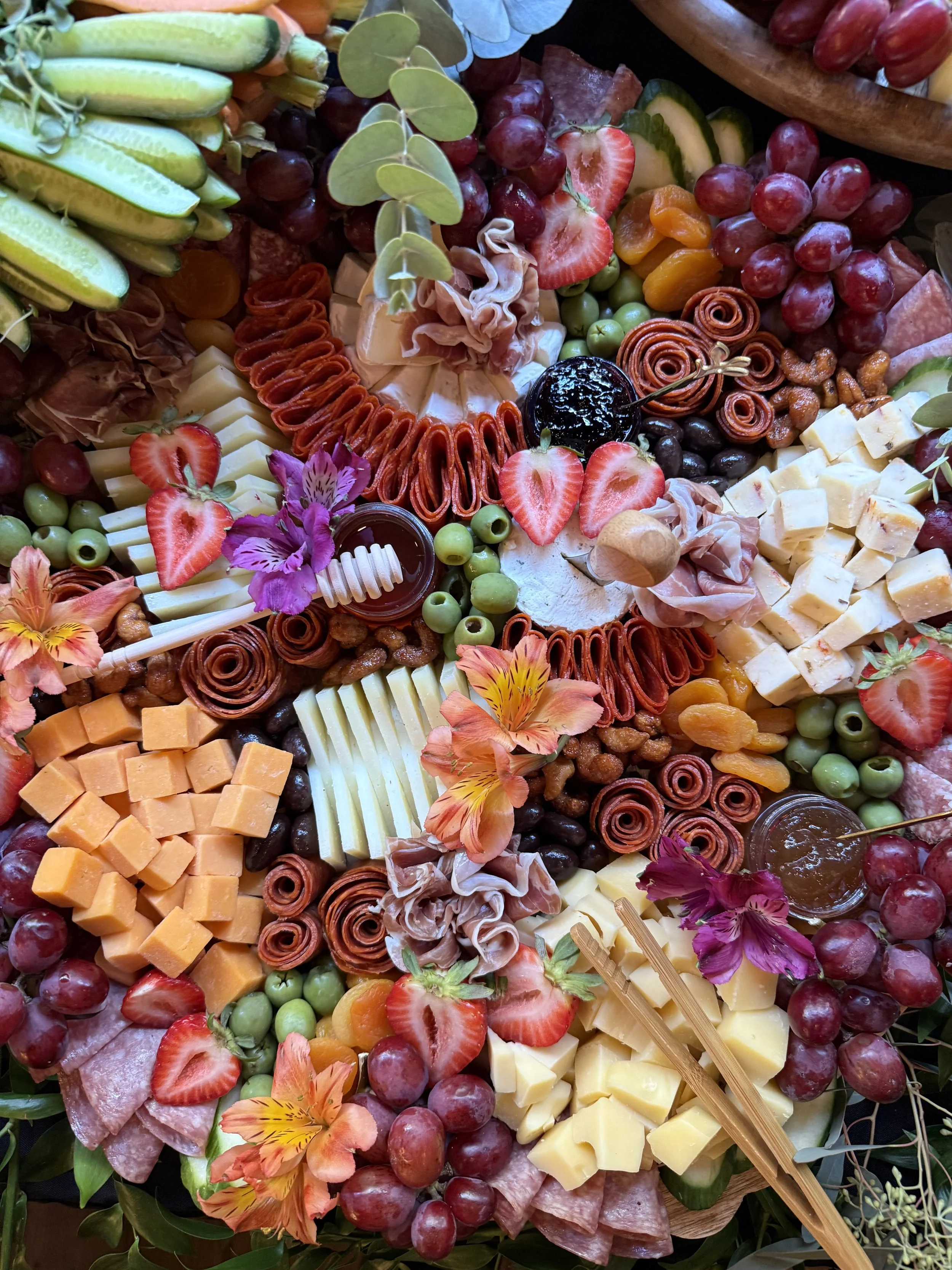 Each grazing experience is a unique one of a kind custom curated masterpiece featuring a classic array of artisan cheese and charcuterie meat, seasonal fruit, nuts, olives, gourmet chocolates, jams, honey, crackers, and fresh herb garnish. We cater to all dietary restrictions and preferences and can upgrade to all types of gourmet cheese and charcuterie.