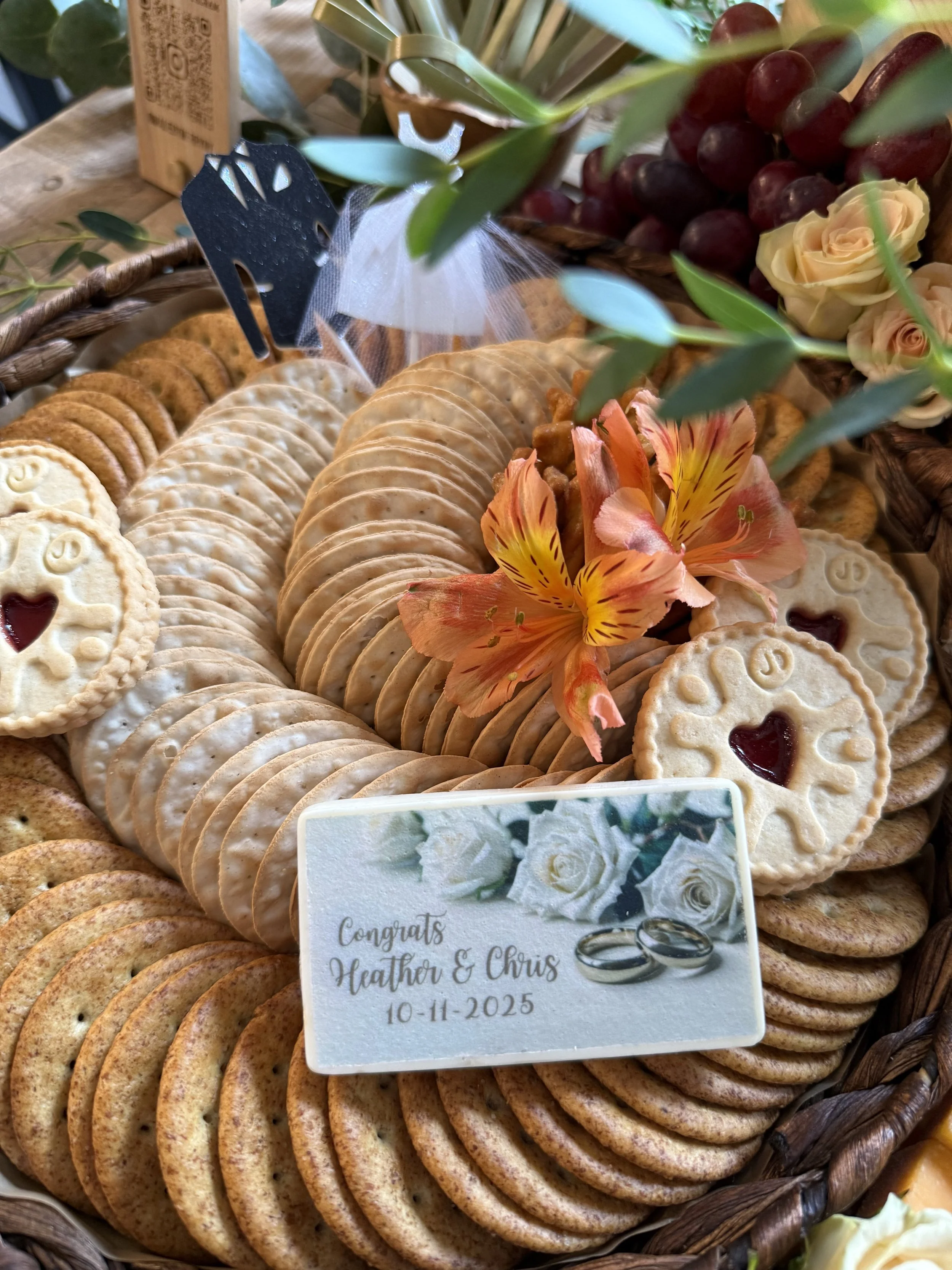 Similar to the Flat Lay Style designed with addition tiers featuring specialty boards from our full menu such as Brie Cake, Crudité, Just Cheese, Exotic Fruit, Mozzarella & Tomato, Artisan Cracker Baskets, Fresh Baguettes, Bougie Dessert Boards, Fresh Baked Desserts, Candy Charcuterie, Gourmet Bread Baskets and more! | Choose your theme (ex. wedding, shower, birthday, anniversary, holiday, company event, family get together, etc.) | Personalized Chocolates, Floral Accents, Table Greenery, and Linens, available upon request
