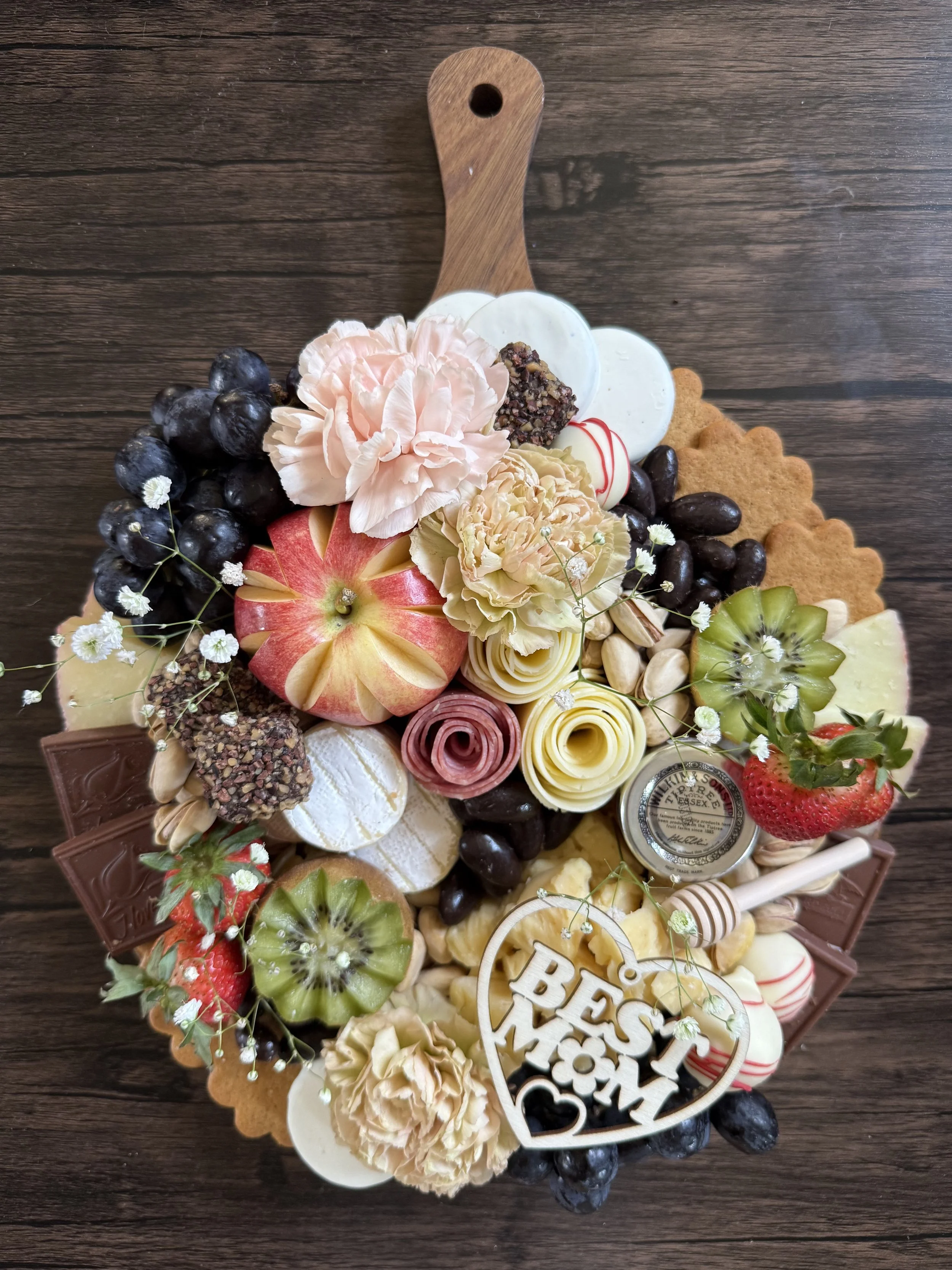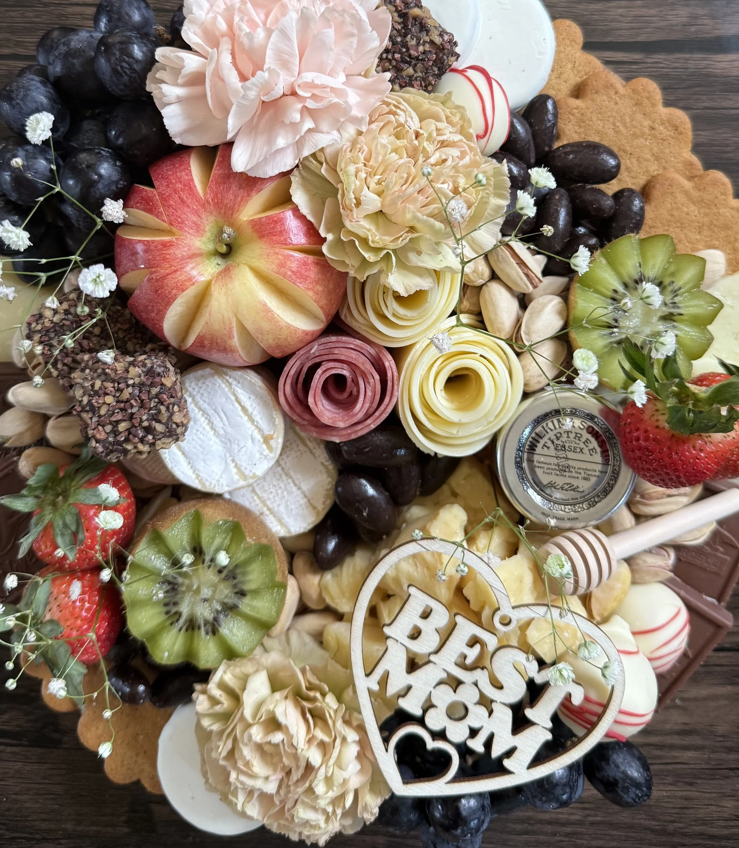 This Mother’s Day, join us for an intimate luxury workshop where you’ll build a stunning cheese & chocolate charcuterie board — layered with gourmet cheeses, cured meats, fresh fruit, and decadent chocolate, adorned with beautiful blooms & festive décor that make it almost too pretty to eat. Almost.
