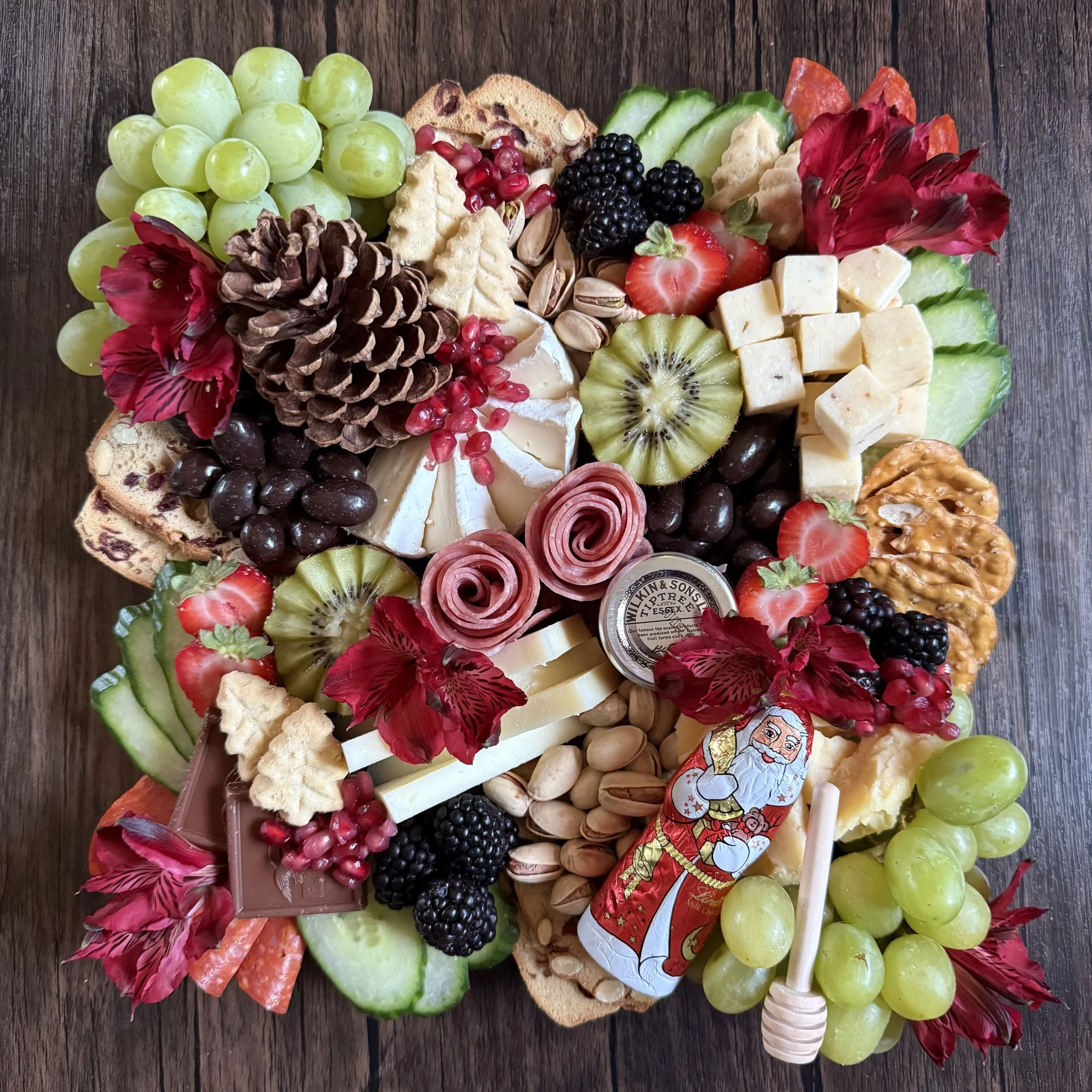 * An exquisite wooden board, all cheese & charcuterie, sweet and savory holiday accoutrements, honey jar & dipper, and fun festive treats.