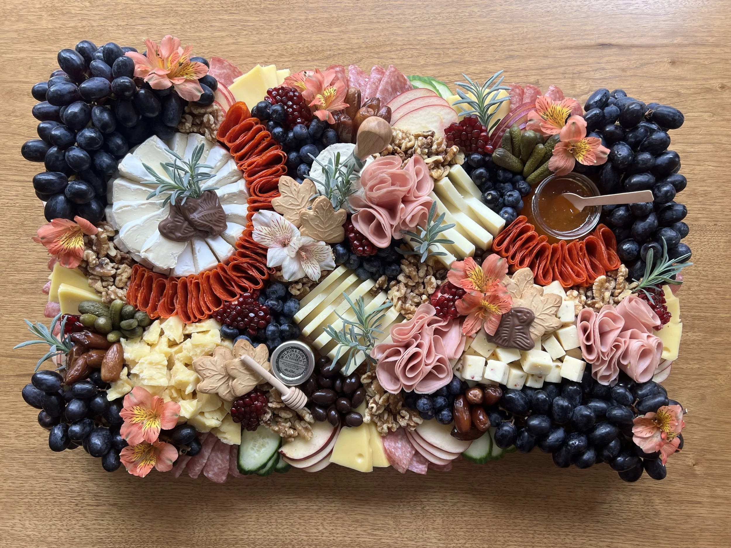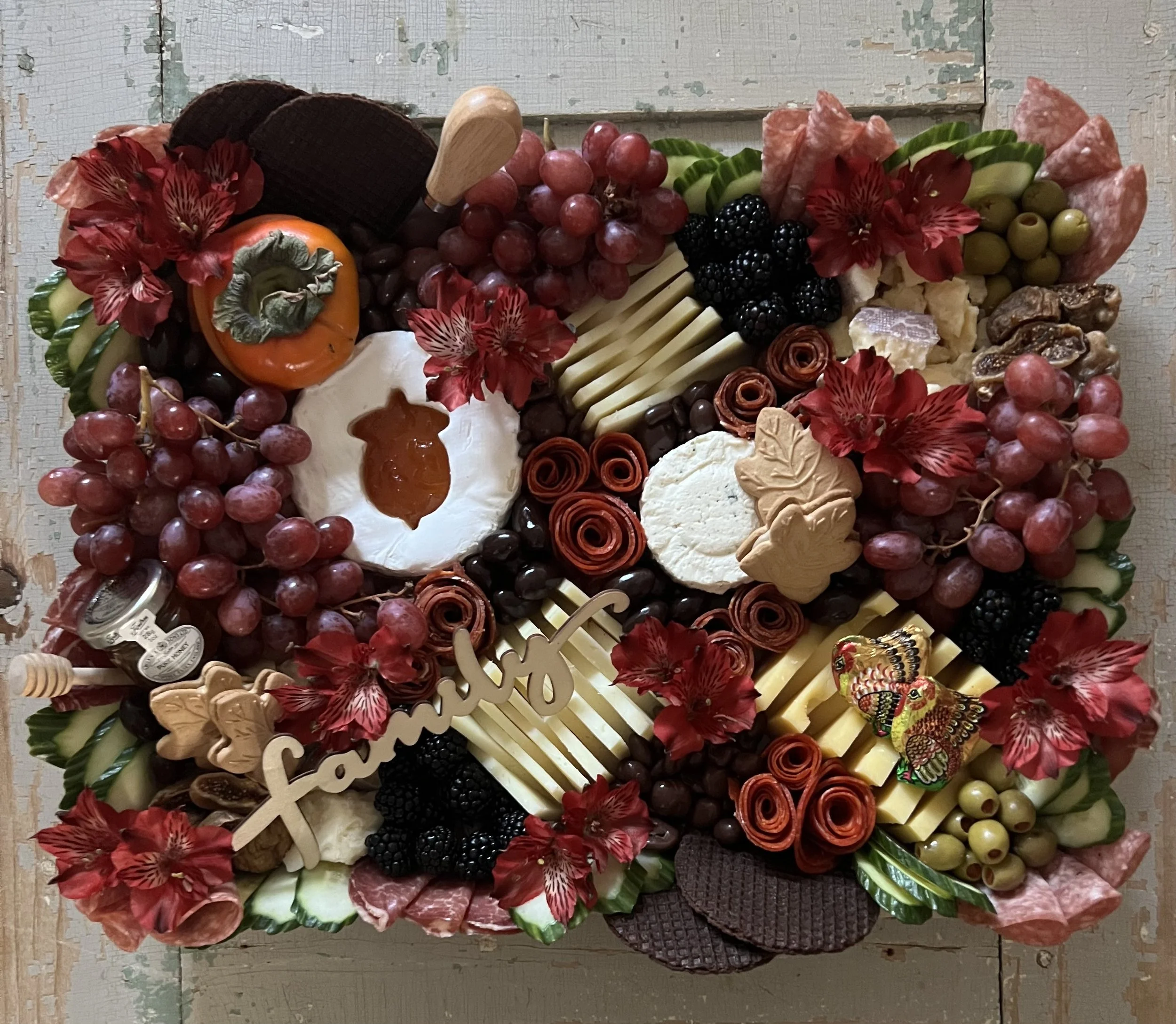 Designed to impress your guests and elevate your gathering, this exquisite charcuterie is where gratitude meets gourmet. The perfect centerpiece on your holiday table.