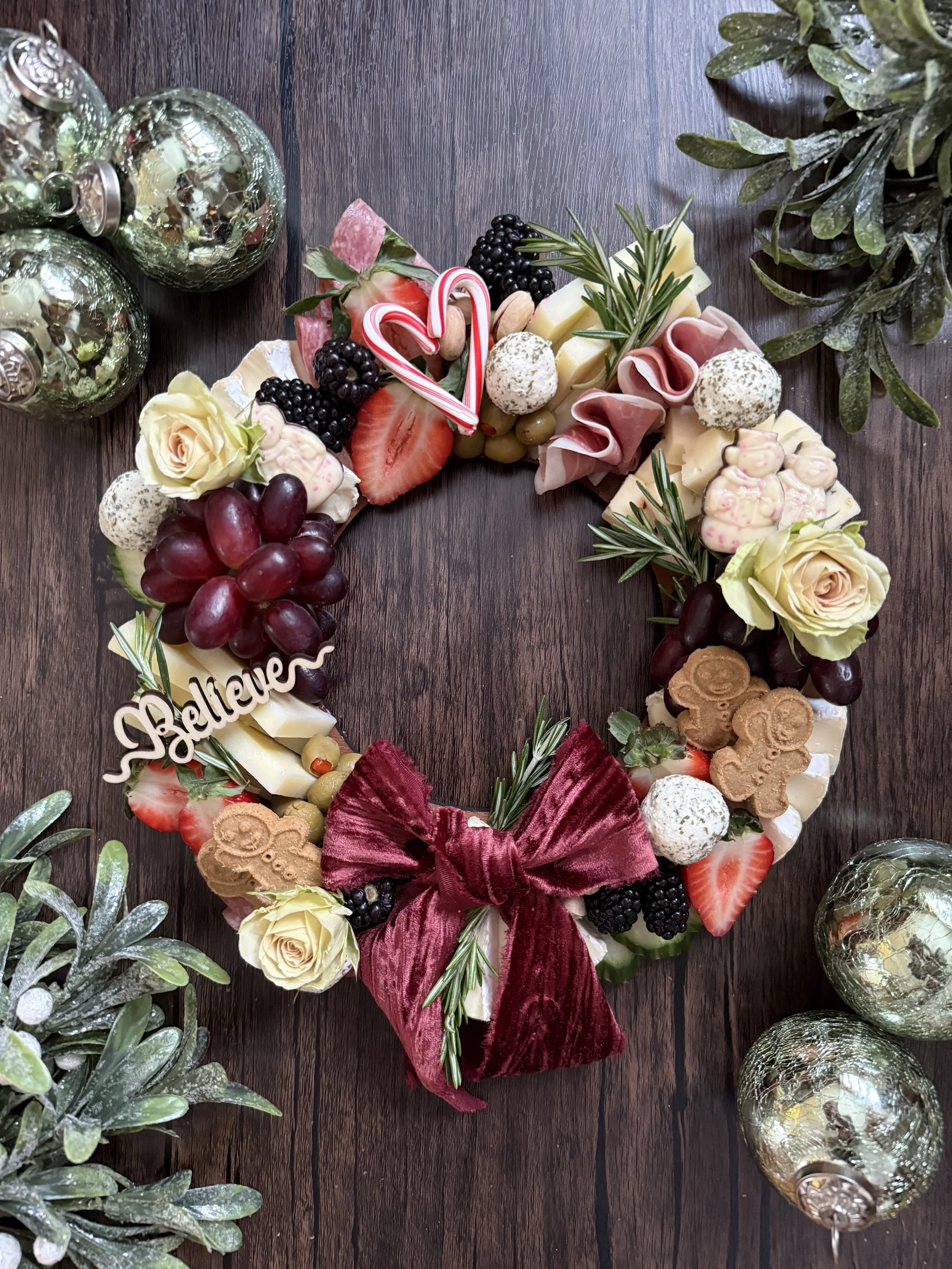 Our Wreath Charcuterie is a showstopping holiday centerpiece, thoughtfully designed to delight both the eye and the palate. This handcrafted arrangement serves 2 to 4 and features a curated selection of four artisan cheeses and two premium meats, artfully layered with decadent seasonal fruits, olives, candied nuts, gourmet chocolates, specialty cookies, and an assortment of festive sweet treats.