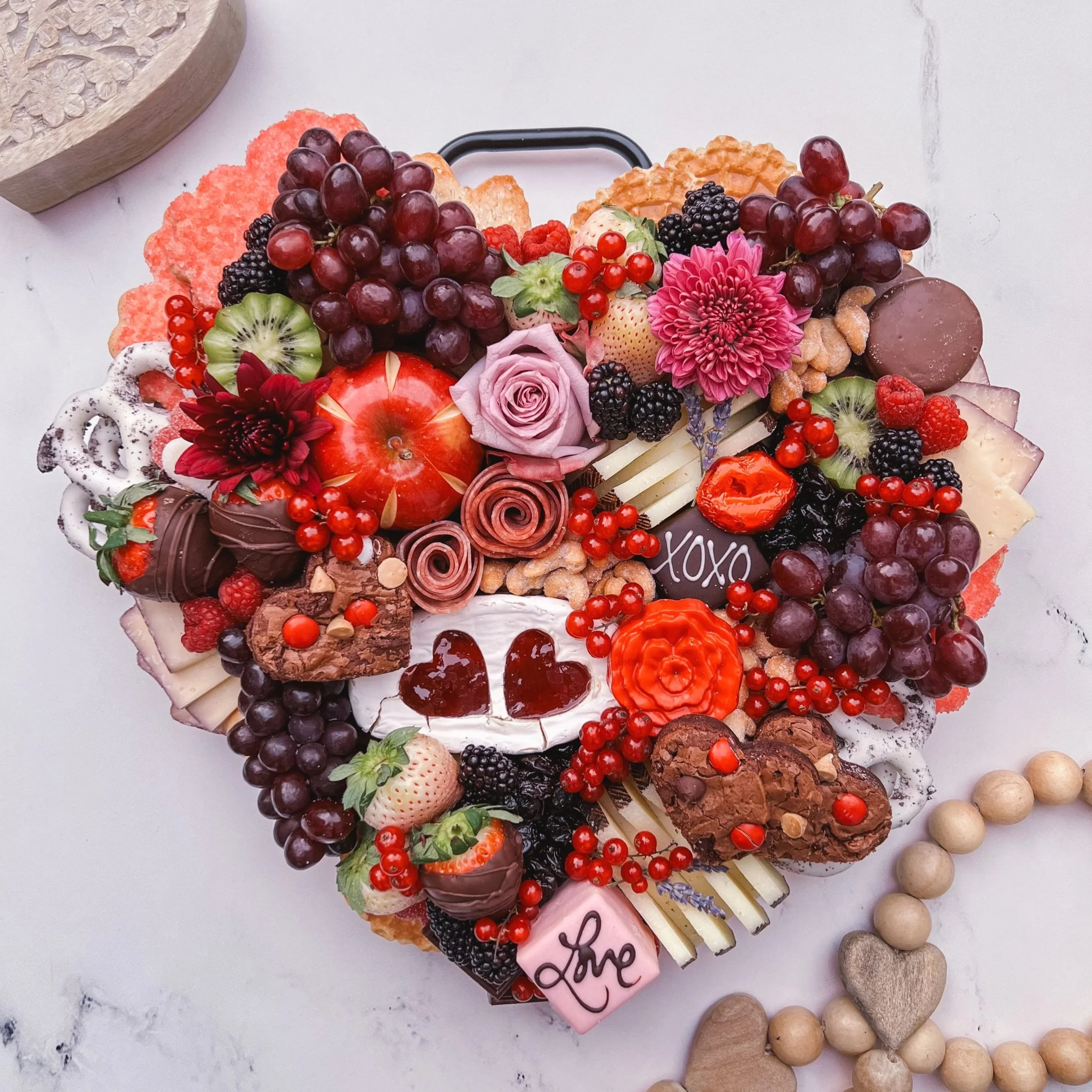 The All Things Love grazing table is a show-stopping, culinary masterpiece, curated along parchment paper on your choice of flat lay surface (table, island, bar, etc.). It is perfect for Black tie Valentine’s & Galentine’s soirées, champagne cocktail hours, corporate events, or an intimate gathering of friends and family,