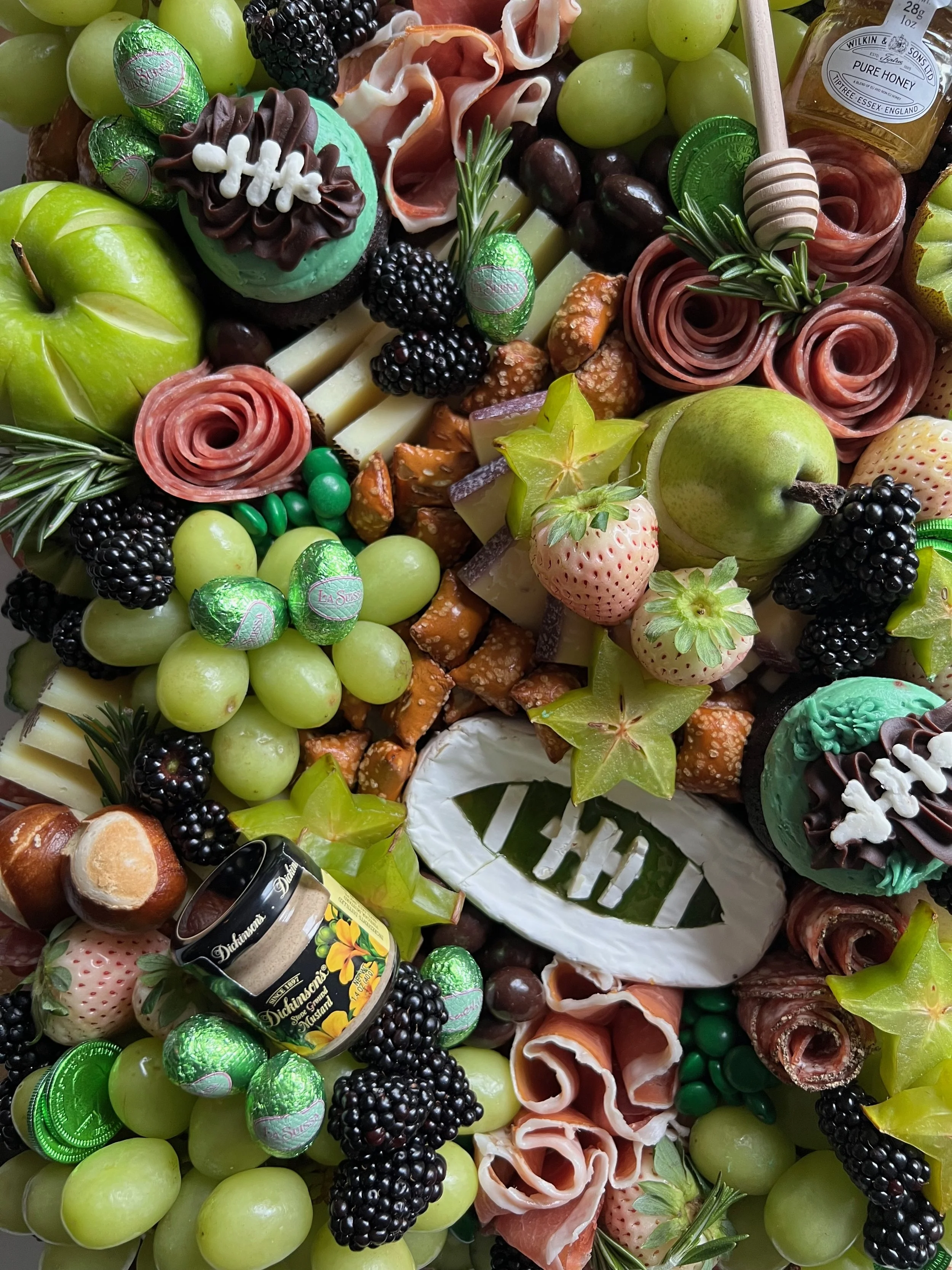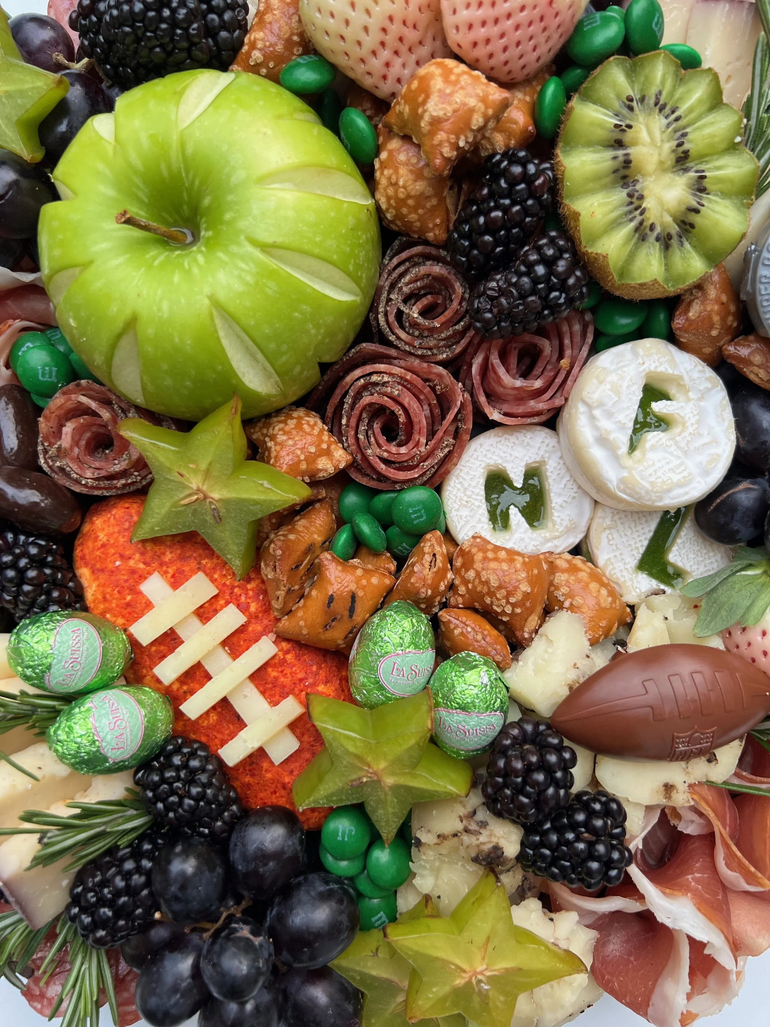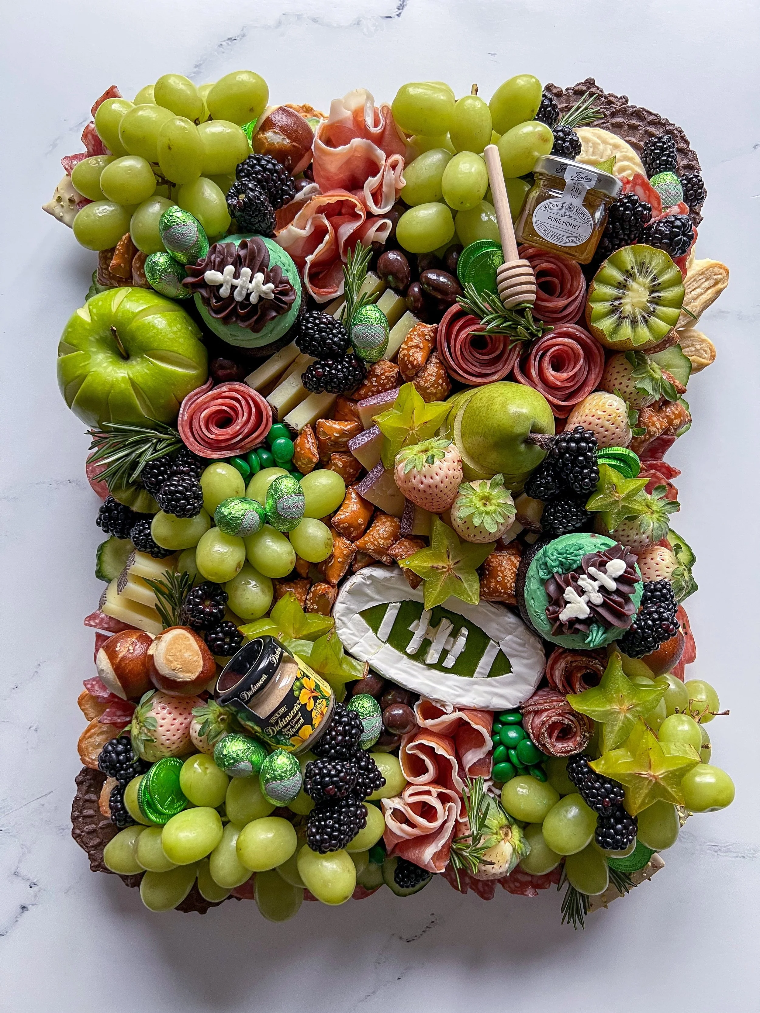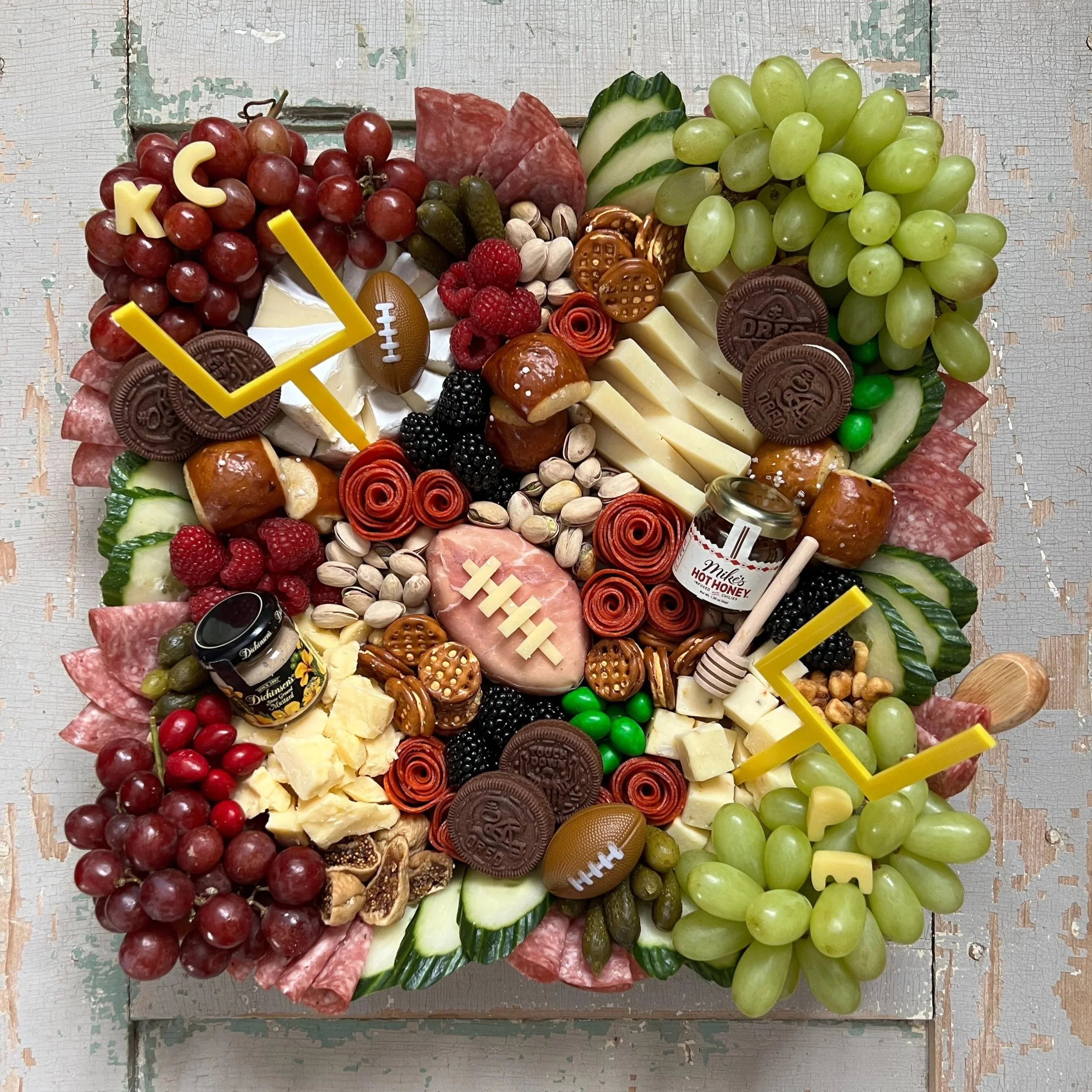 Every board comes with varying gourmet game-day bites such as soft & crunchy pretzels, candy-coated peanut m&ms, roasted & salted nuts, corn nuts, cornichons, olives, and a jar of mustard and Mike’s Hot Honey (dipper too!). All this then topped with a delicious assortment of game day-themed cookies, sweet treats, and decorative super bowl accents.