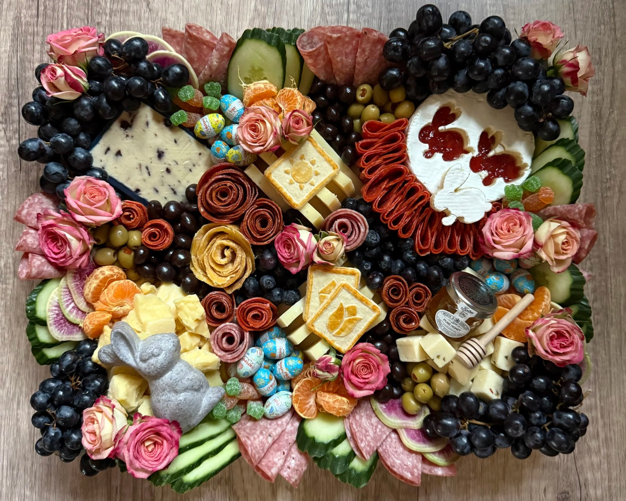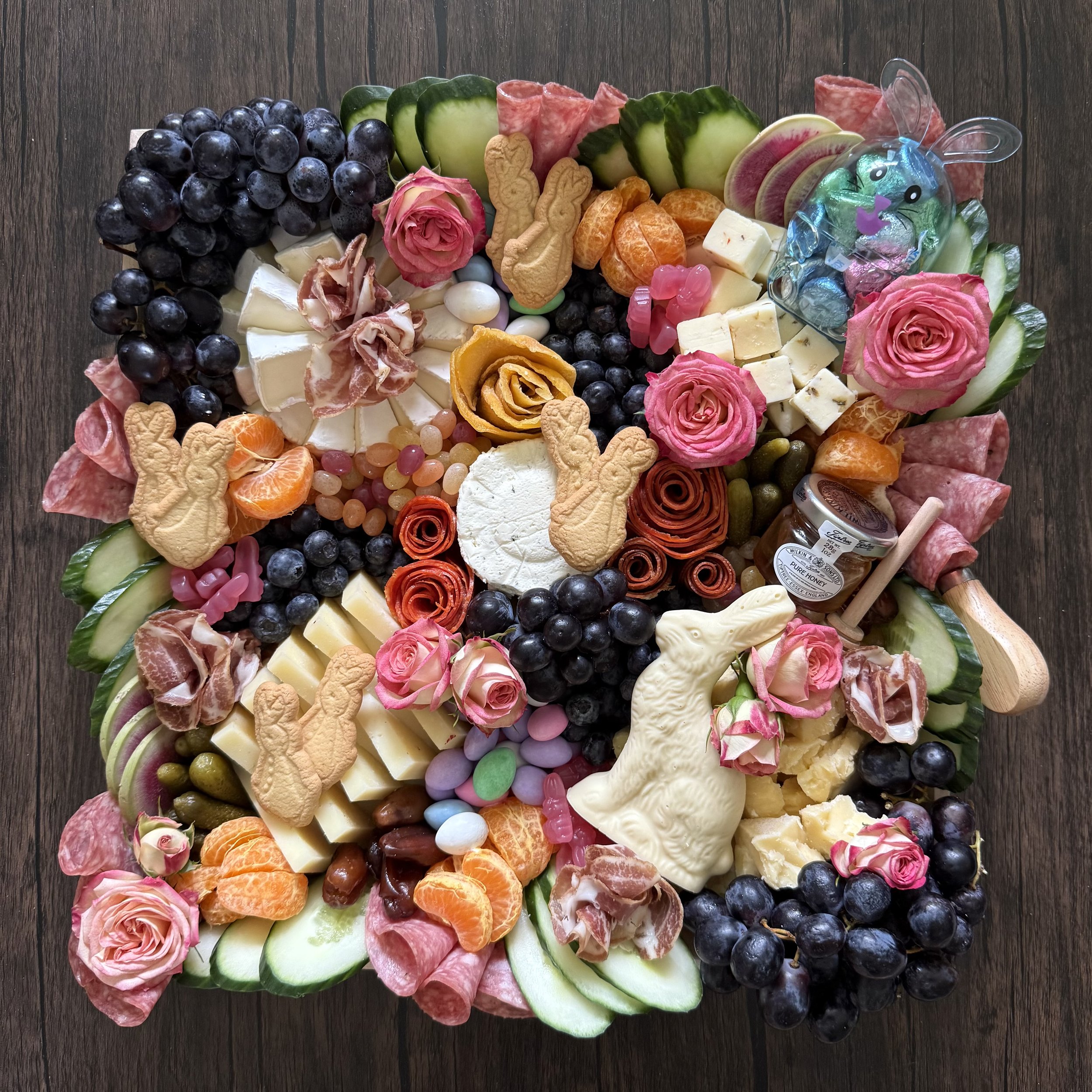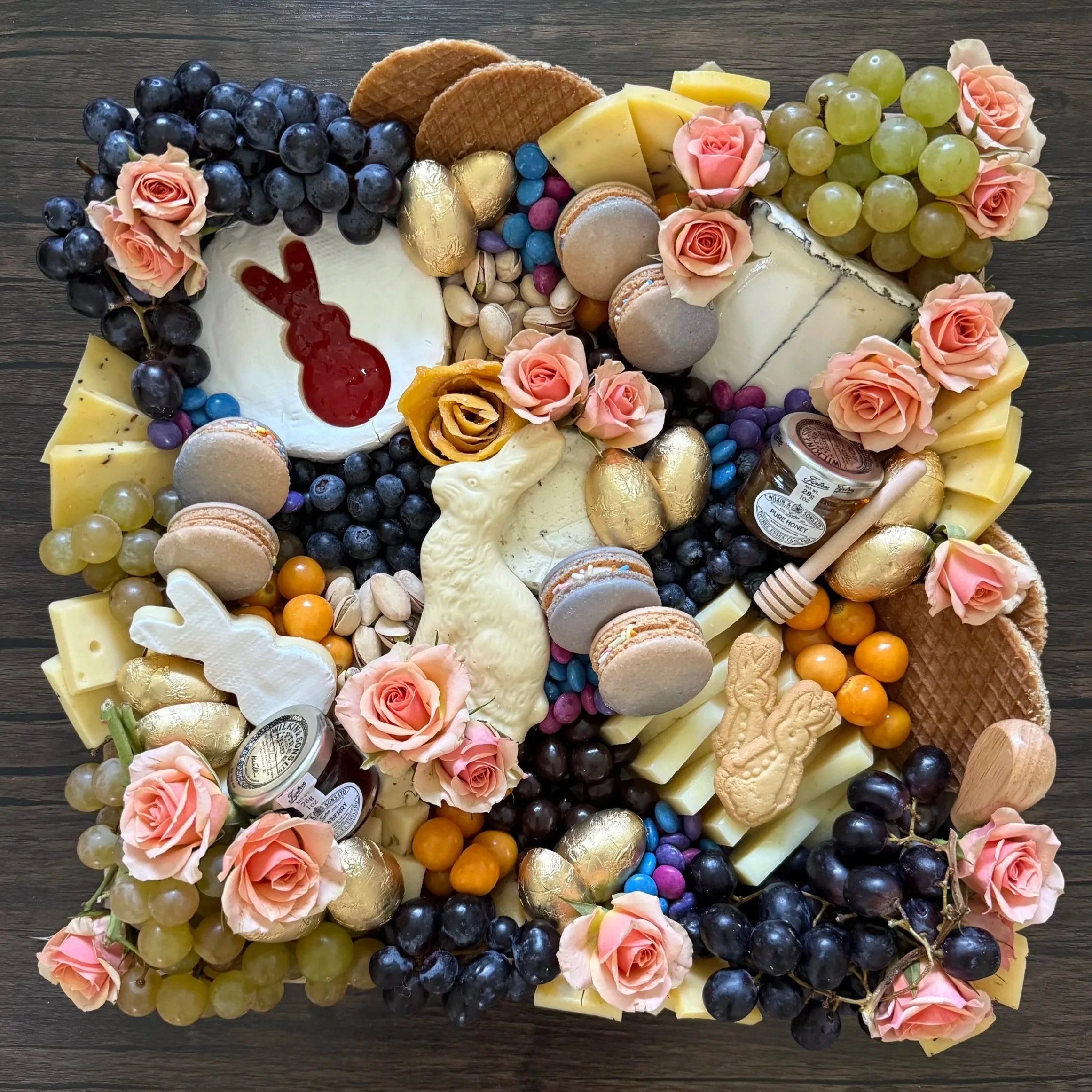 Featuring a premium selection of cheeses, artisanal meat (meat-free option), seasonal fruits, nuts, imported chocolates, festive sweet treats, honey, jam, and gourmet holiday accompaniments, all arranged in a stunning spring-inspired presentation.