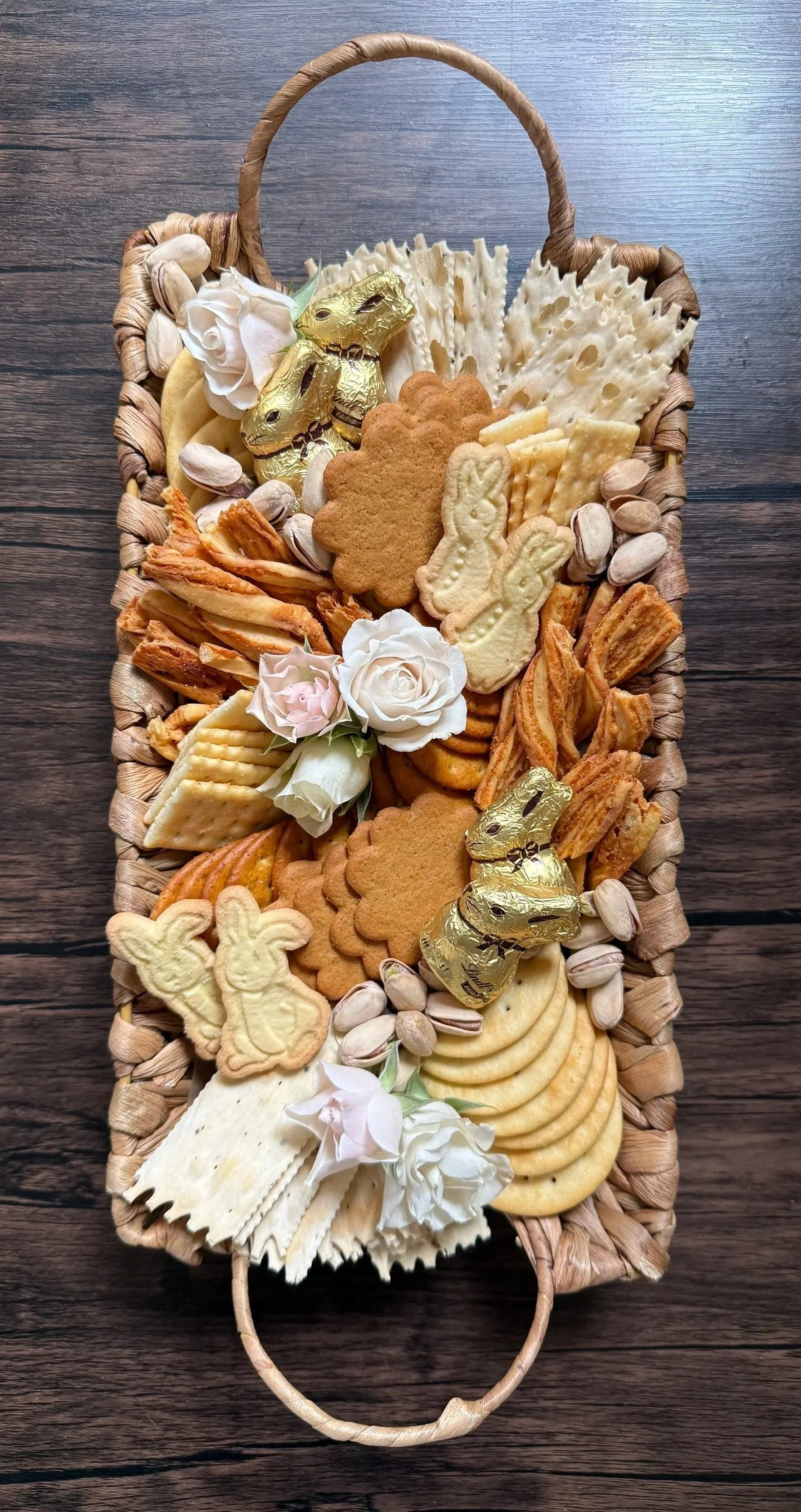 * One Artisan Cracker Basket with a variety of crackers, breadsticks, cookies, nuts, holiday chocolates, and fresh floral decor.