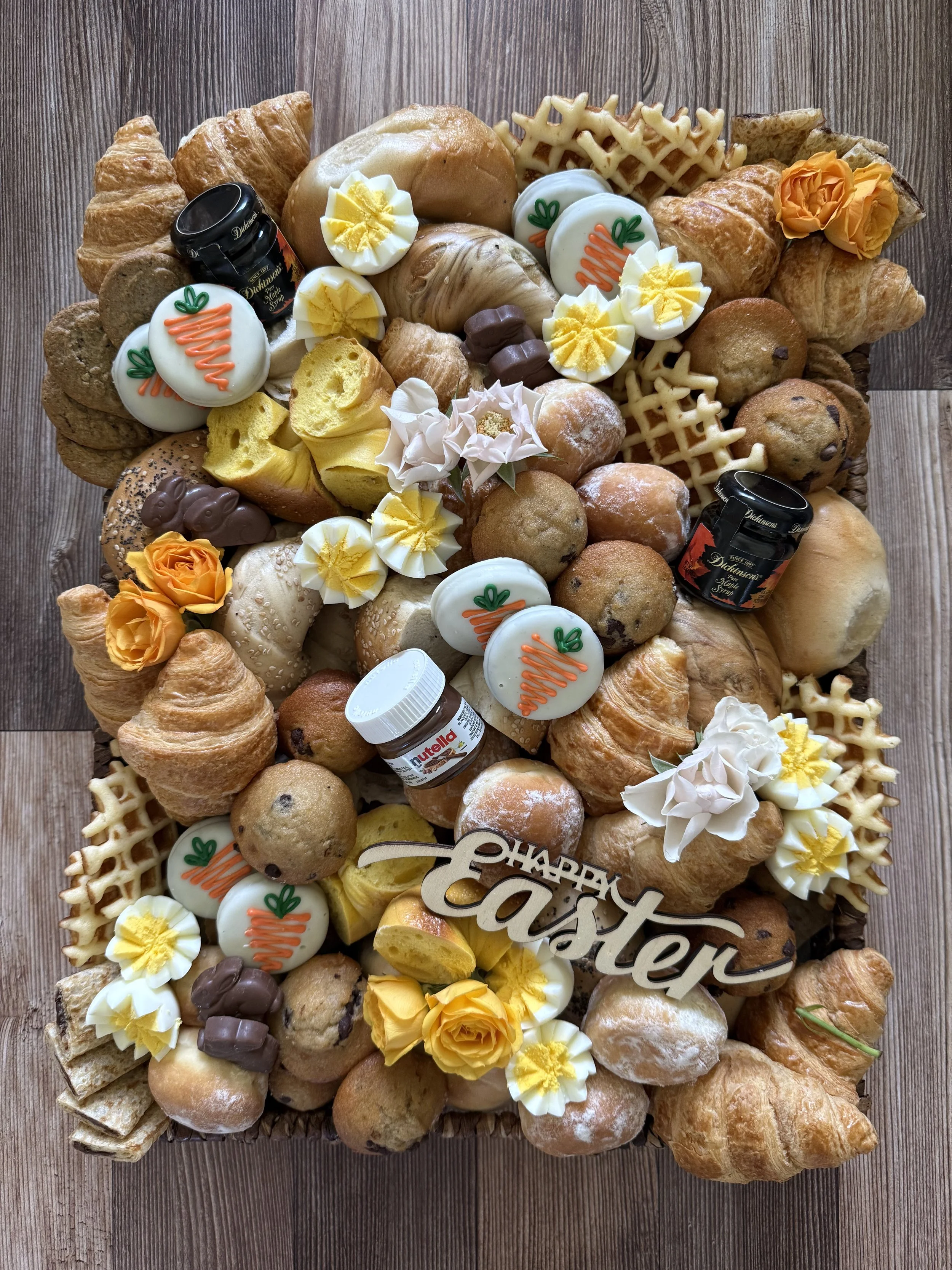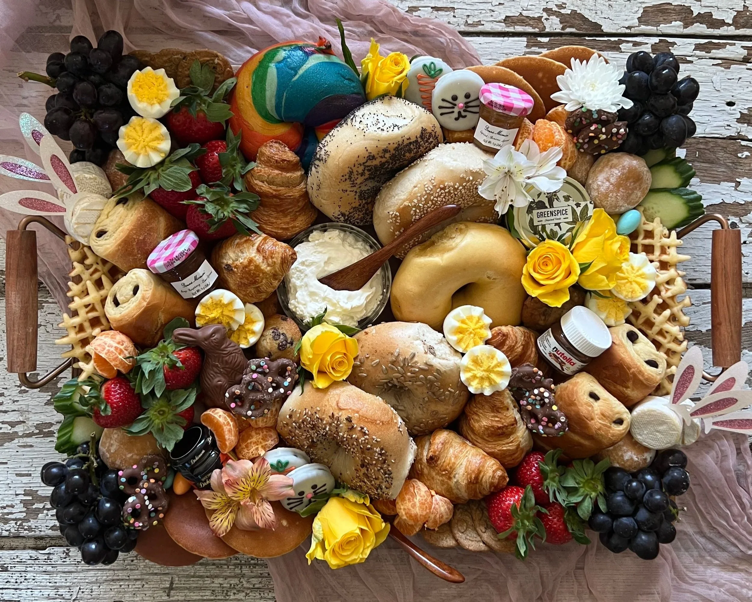 Filled with a delicious mix of sweet and savory brunch favorites—bagels, croissants, waffles, hazelnut/berry beignets, hard-cooked eggs, and other assorted pastries, along with fresh fruit, spreads, and Easter-style treats.