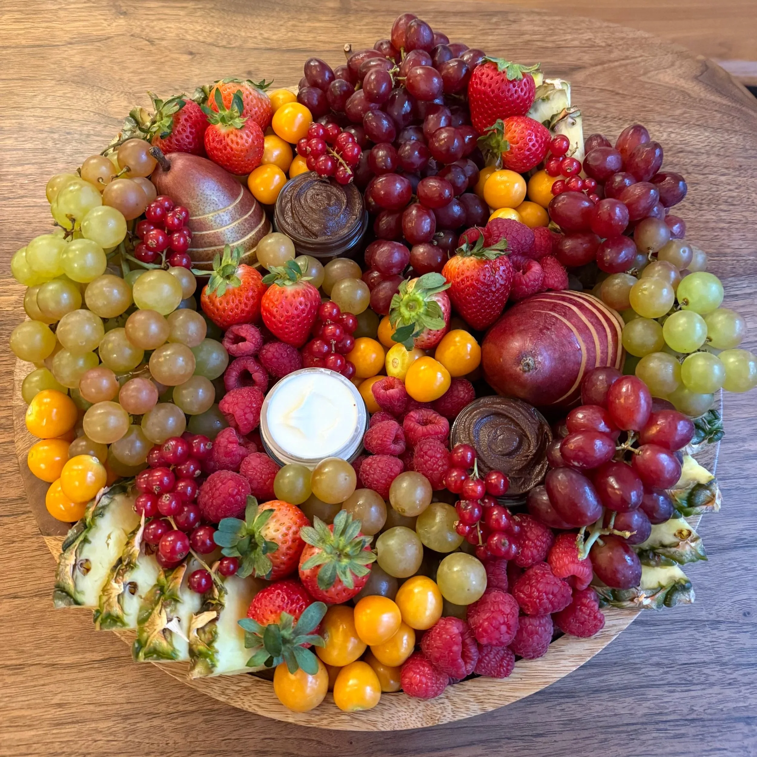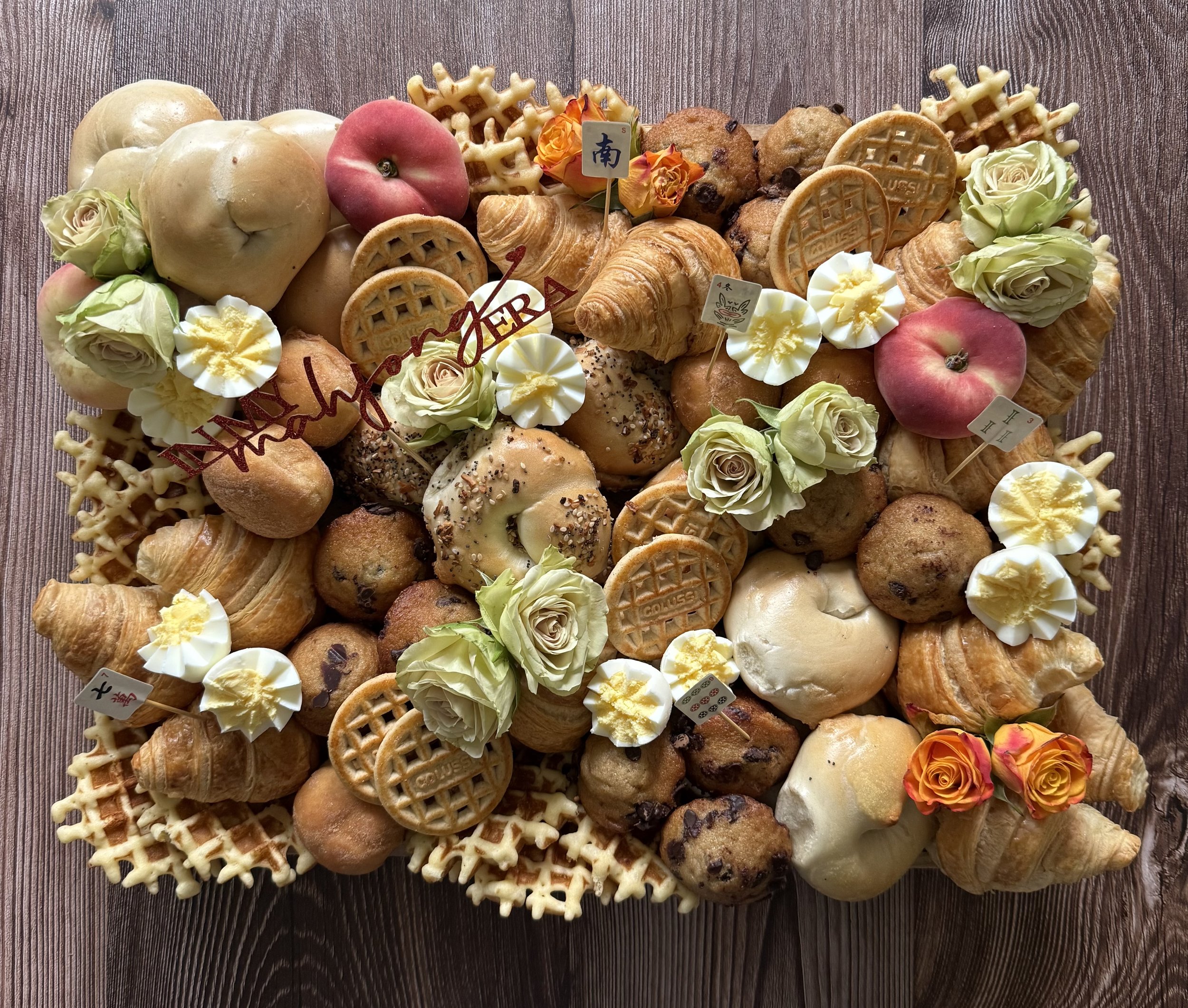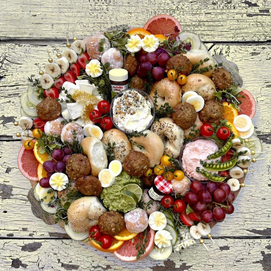 Featuring a premium selection of cheeses, artisanal meat (or meat-free), seasonal fruits, honey, jam, assorted bagels, cream cheeses, butter, mini nutella jars, croissants, mini muffins, hazelnut beignets, strawberry crepes, and fresh veggie garnish, all arranged in a stunning edible presentation. (optional add-ons include waffles, pancakes, & syrup, greek yogurt parfaits, and stylized hard boiled eggs)