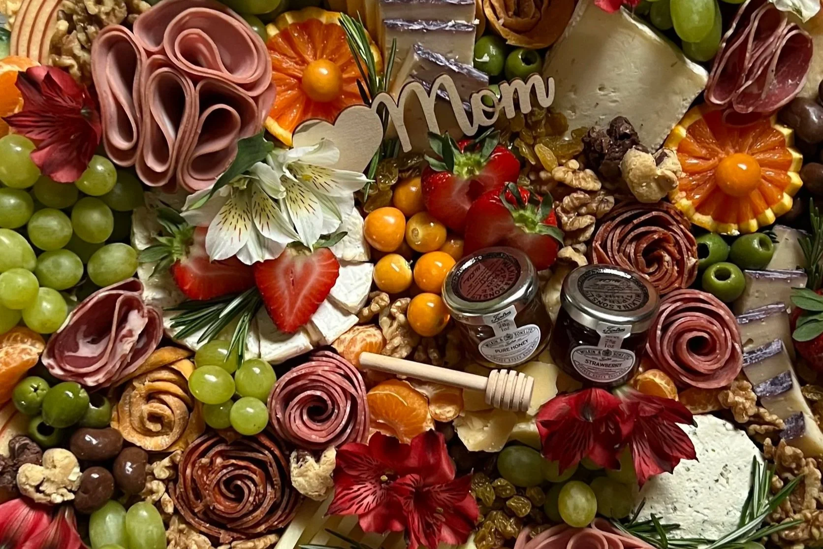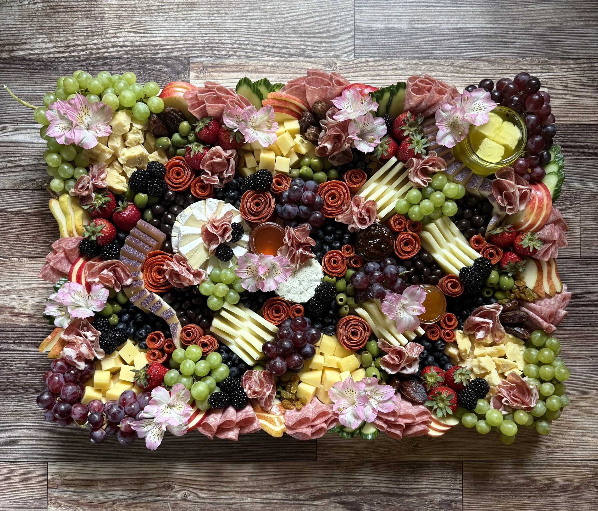 Our signature, handcrafted & bestselling charcuterie board features a delicious selection of gourmet cheese, premium meats, seasonal fruits, dried fruit, nuts, olives, cornichons, gourmet cookies, imported chocolates, mustard, honey, jam, fresh herbs and floral garnish.